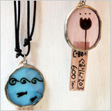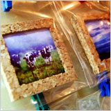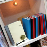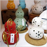 新作ご紹介。写真上段は手作りインテリアの『波間工房』さん。人気のひょうたん(本物ですっ)ランプに新色&新型入りましたー。ポップカラーが追加され、大きさもちょっと小さ目でさらにかわいらしさUP。すべて中に入れるランプ+電池付きで、800円〜1,200円。/写真・下段は新規ご契約。スケジュール帳を”れんこん”型にくり抜いたアイデア作品。向こうが見えます(笑)。これはやられましたっ。すごいインパクト。手帳の色は全部で6色あります。どうぞお手にとってご覧ください。 |