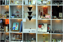 Bの棚のど真ん中に斉藤潤一さんのボックスが登場しました。そこにあるのは、床面に引き出しを設置し、上部を純粋に展示用スペースとして独立させたミニマルなギャラリー。現在展示されているのは『胸キュン・の角度』と題されたオブジェ。数々の受賞歴を誇るアーティストの1年間に渡るミニマル・ギャラリー展示が始まりました。とにかくこれはご覧いただいくしかないと思います(笑)。 |