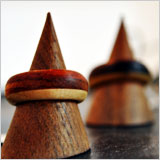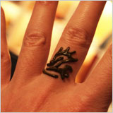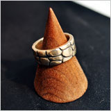 新作ご紹介。シルバー作品を出展の『吉日』さんの新作です。今回は素材を変えて木製のリング(写真・左)。カラーは3種類。シンプルで飽きの来ないデザインとつけ心地です。定番の鱗リングも健在っ(写真・右)。 |