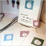 ポストカードラックの新作ご紹介。左は今年5月にroomで個展を予定されているhirosawaさんの作品。他に写真作品もあり。右はお馴染みハタ・タカヨシさんの『アートヤン』シリーズ。メッセージカードもありますっ。 |