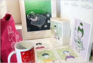 ボックス作品ご紹介です。写真・左は「MegRu」展にも出店されていたモリヒロミさんのボックス。随時原画を入れ替えれていますが、今はパンダが寝ております〜。ポストカード、マグカップなども販売中。写真・右はイラストレーター・