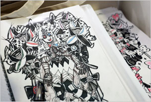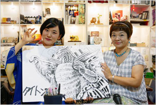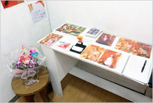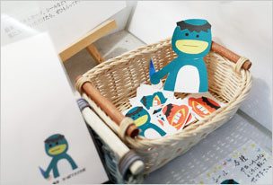 」さんのボックス。オリジナルキャラクターの原画イラスト、トートバッグなどを販売されています。作品ファイルもぜひご覧ください。写真・右は「かっぱで大さわぎ」のボックス。かっぱの物語フリーペーパー、シール、ポストカードなど無料で配布されています。インパクト抜群の”ビッグかっぱ”シールはあと一枚ですっ。お早めに〜。