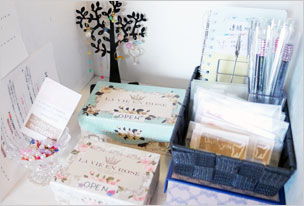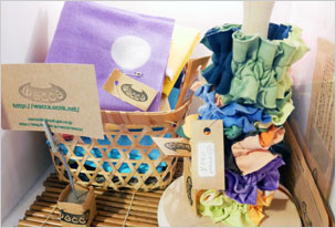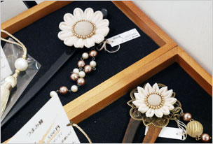 ボックス作品ご紹介です。写真・左はキモノコモノ連にも参加されている染作家・waccaさんのボックス。絞り染めによる手ぬぐい、シュシュなど展示&販売されています。一部作品は233オンラインショップでもお買い求めいただけます。写真・右は「K-クラフト研究所」さんの作品。つまみ細工によるかんざしです。繊細で落ち着いた雰囲気ですが、しっかりかわいいですっ。下がり部分は取り外し可能です。