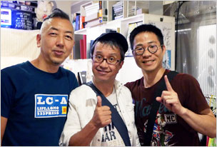 ”佐藤さん(左は共同監督のJON氏)。さらに詳細を打ち合わせ。いい感じのケースになりそうです。クラウドファンディングは9月末まで。よろしくおねがいしまっす。
