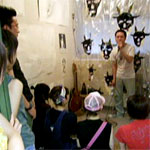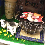 マックのPowerbookをボックスに常設してインスタレーション「Touch Me There」を展開するisaki君と鉄のナガイさんがいきなりセッション(写真・左)。マックに接続されたセンサーにぶら下がった3匹の古代魚、で、どうなる?乞う、ご期待。/真ん中はイラストレーター・ヨコヤマユウコさんのポストカード。いろんな動物や妖精達が登場する不思議な世界。きっとこの世の裏側にあるに違いない。ホームページでも作品が見られます。ぜひ。/写真・右は三軒茶屋に出来た新しい居酒屋『とかちまる』さんのボックス。名物・磯焼きの造形が素晴らしい。腹減ります。かわらばんやクーポン券もあります。 |