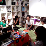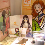 左上はミニカードいっぱいのボックス。使い方はいろいろ。ディスプレイもうまい。お気に入りの一枚を選んでください。/右上は「マヌキャンドル」さんの手作りキャンドル。きのこ型もあります。満月カフェでも使わせていただいてまっす。/左下は「Yuka Furukawa」さんのイラスト。お人形ライクな女の子たちがかわいい。ポストカードも販売してます。WEBも要チェック。/右下は個展も大盛況だった「まえだふきえ」さんのボックス。カラー手ぬぐいが登場。コースターも新作。眼鏡かけてます。 |