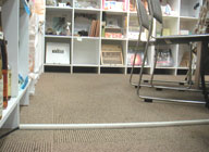 店内はとりあえずぎりぎりながらも1周できました。しかし、川口さんの車いすのサイズを考えると、もう少し大きなサイズの車いすの場合は、机の位置を変える等の対応が必要になりそうです。後、写真手間に写っているコードカバーも問題はなかったものの、バリアフリー仕様のものもあるそうなので、これは要検討。
